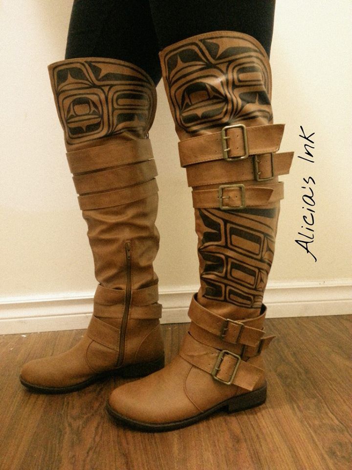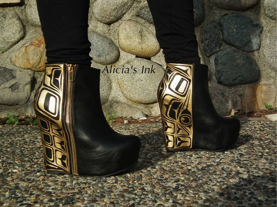 Alicia is a true artist who can transform a plain pair of boots or flats into works of art. Alicia, a member of the Nuu-chah-nulth Nation of British Columbia, wanted to see clothing, shoes and accessories of Native design that you could wear every day, and not just on special occasions. Drawing traditional animals on her shoes has started a new trend and small but booming business for Alicia, whose talents are sought after by hundreds across the world.