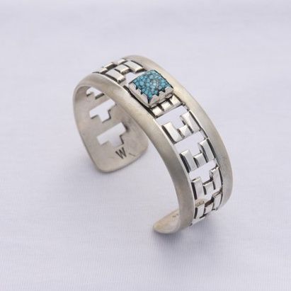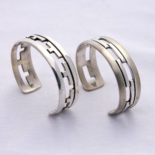 Waddie CrazyHorse is a third generation silversmith from Cochiti Pueblo, New Mexico. CrazyHorse says his new Tetris®-inspired collection of the season is just another step in advancing himself as a silversmith. He started developing his Tetris® design scheme in 2008, playing with new patterns and negative space while designing. CrazyHorse grew up in the videogame era of the early 90s and admits Tetris® was his favorite game to play. “Tetris was my go-to game for my Game Boy, remember those things? [Laughs]” CrazyHorse’s collection has different ‘levels’ of cuffs, ranging from “LvL 1”, which is narrower, to “LvL 6”, which is a wider cuff.