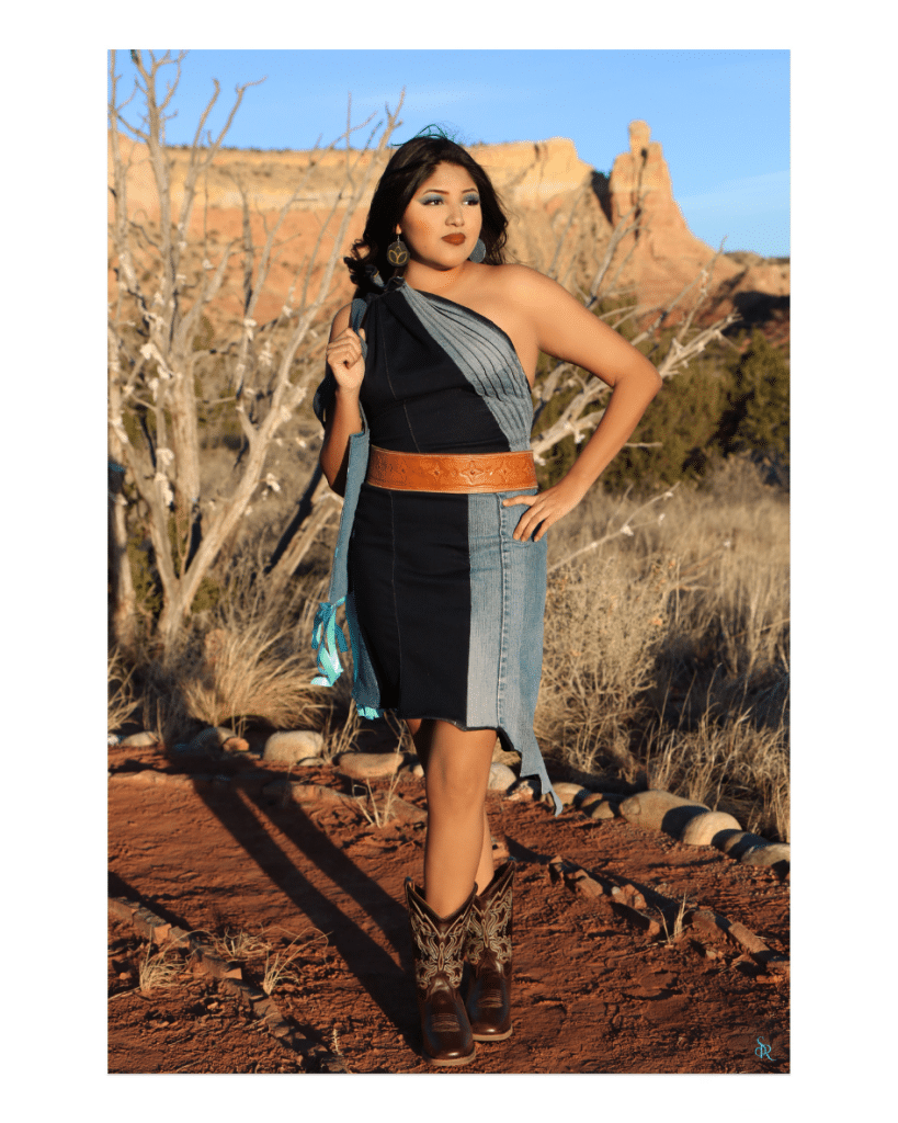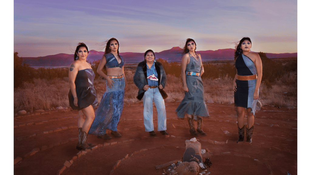 There is a moment, somewhere in the arroyos above Abiquiu, when the last light catches the canyon walls, and the layered rock glows indigo and rust. For Tewa designer Sage Mountainflower (Ohkay Owingeh), that moment is not scenery. It is a blueprint. Her debut couture collection, Indigo Threads, is the translation of that light, that geology, and the ancestral memory embedded in both, rendered in upcycled denim and slow-fashion devotion.