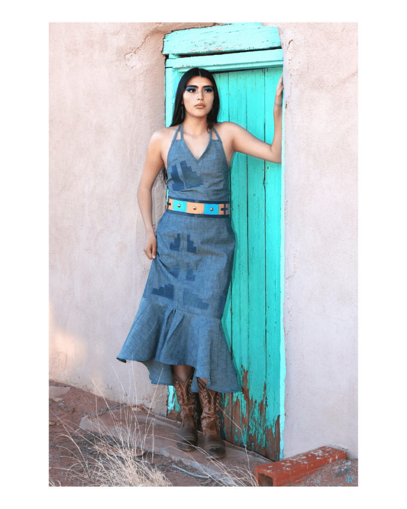 Looking ahead, Mountainflower plans to introduce beadwork into the collection: intentional pops of color she likens to the bright flash of a mountain flower against a monochromatic desert shadow. The deep indigo foundation will remain, but the beads will represent what she calls “blooming life,” a celebration of growth through detail. Her ambition is nothing less than a global standard for what Indigenous couture can be: deeply rooted, unapologetically sovereign, and built to last as long as the mesas themselves.
