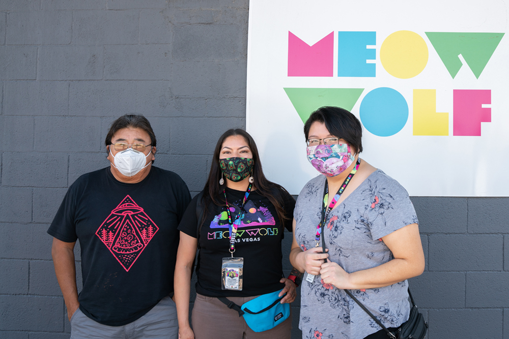 Meow Wolf is different from any other attraction or exhibition. Meow Wolf employs numerous full-time artists on staff who work in a wide range of media including sculpture, painting, fabrication, digital art, writing, film, and many more. At each location, Meow Wolf prioritizes collaboration with local artists in the area of each exhibition. Meow Wolf also gives back to and participates energetically in the surrounding communities of the locations, actively supporting innovative, community-focused art and social projects. In addition, Meow Wolf acknowledges and celebrates Indigenous people today and every day. Meow Wolf’s three locations all sit on the ancestral lands of the Pueblo, Southern Paiute, Southern Ute, Ute Mountain Ute, Arapaho, Northern Cheyenne, and Oceti Sakowin (Dakota, Lakota, and Nakota) peoples. Meow Wolf has taken steps to include Indigenous people in the creation of Convergence Station. As with the other Meow Wolf locations that have built relationships with the local Indigenous populations in the area, Convergence Station included the Denver Native community in the planning, making, and launching of its newest location.